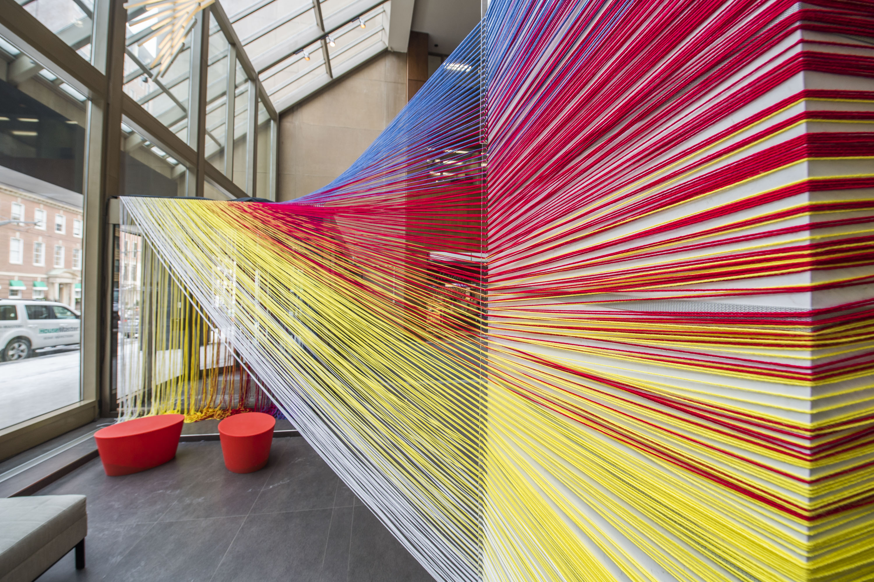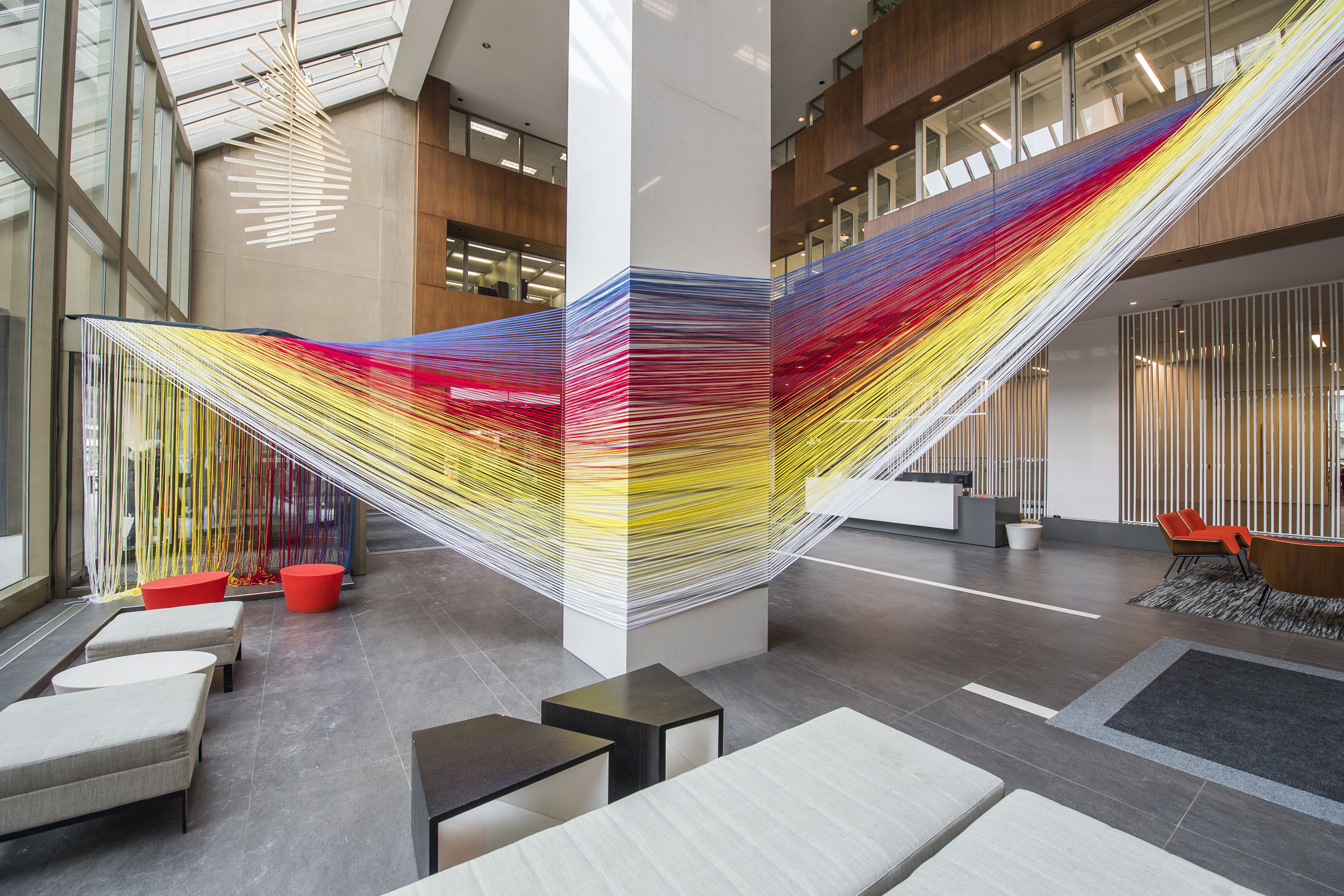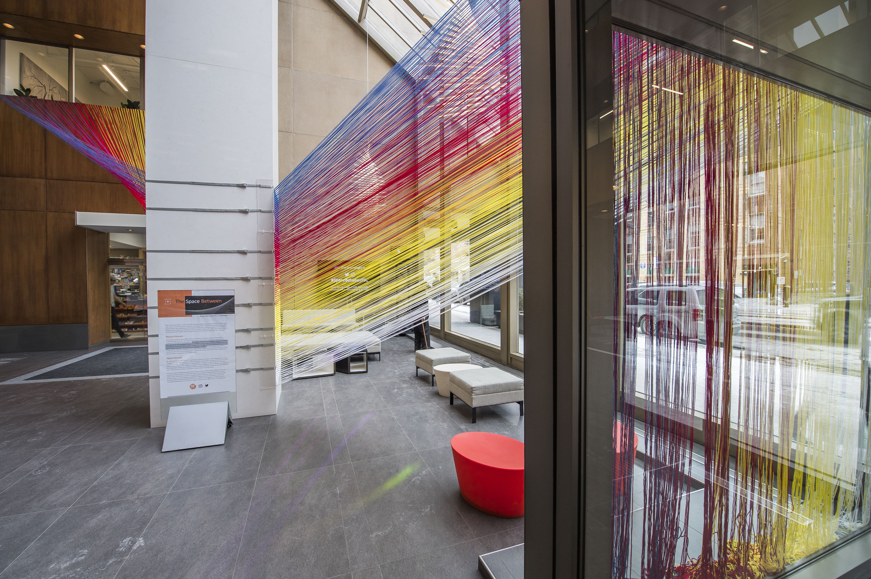 The Space Between consists of over 6,000 meters of interwoven coloured string, transforming the multi-level lobby at 55 St. Clair West with an infrastructure of horizontal and vertical planes, cutting and shaping the existing space. The combined length of the string used to build the installation is equal to the approximate distance required to pull a single, continuous line from the building lobby, to Toronto landmarks such as the Toronto Waterfront, the Don Valley, the Junction and Yorkdale Mall. By IBI Group