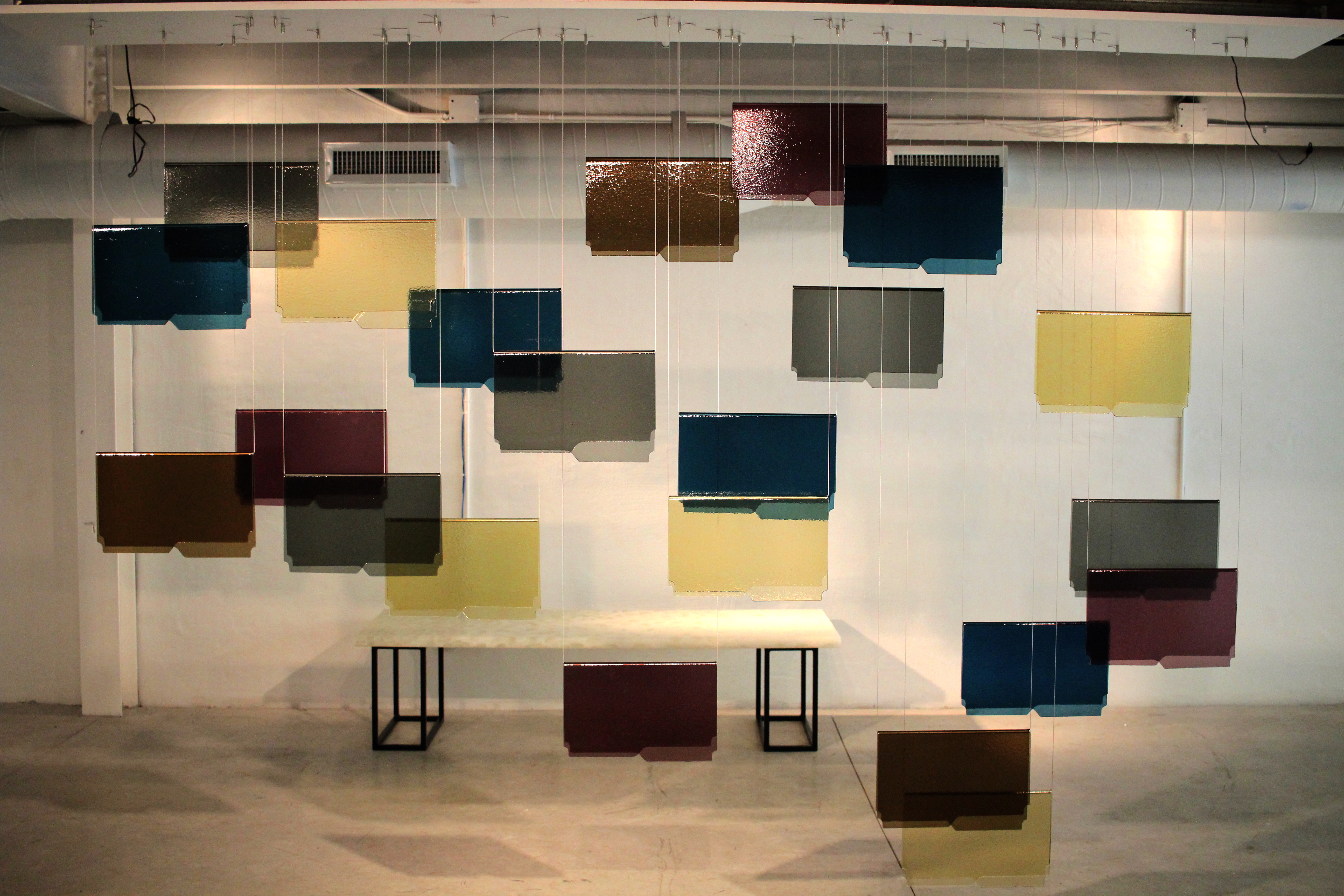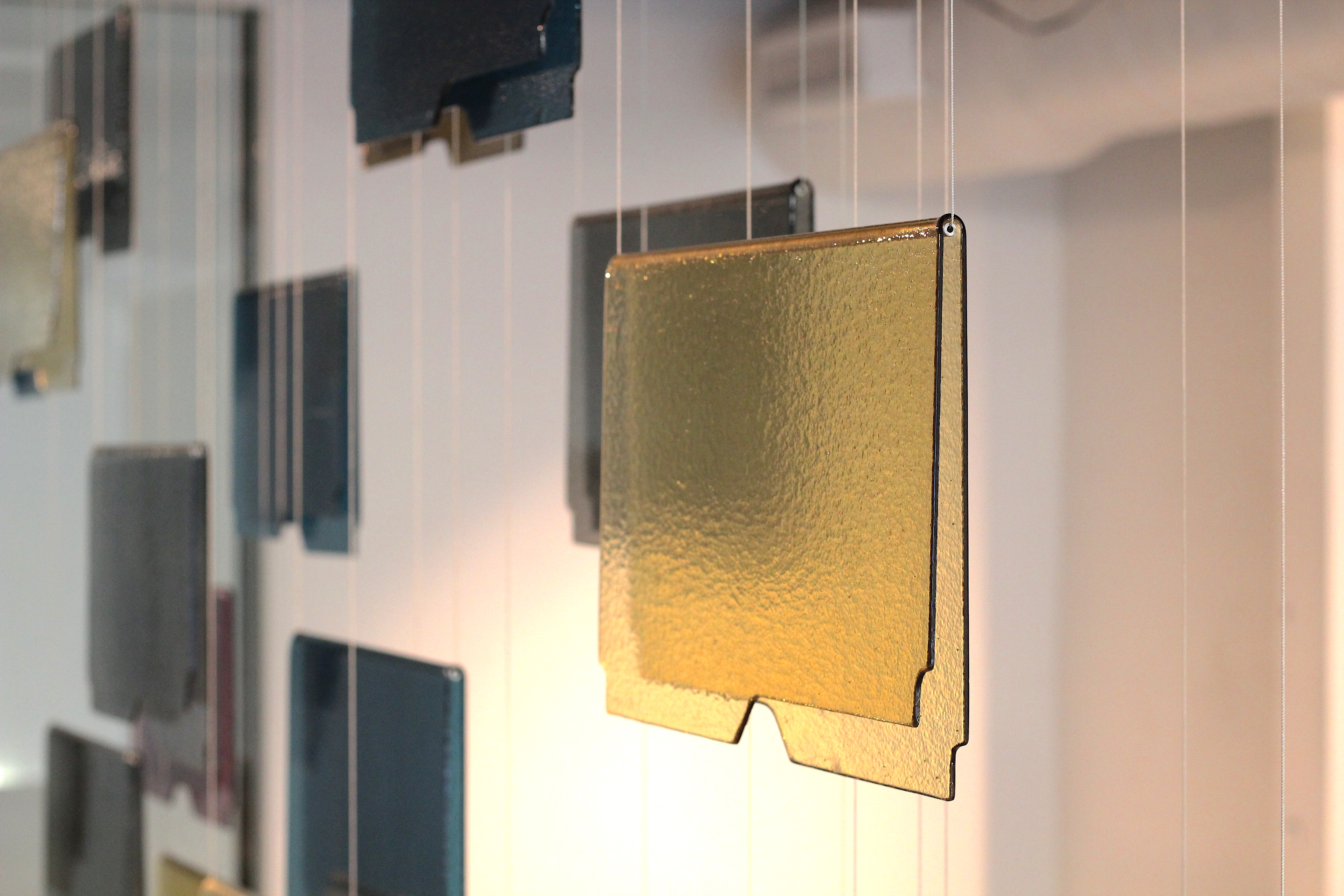 Mountain Fold sees fragile glass carefully folded and shaped like a vernacular file folder, and then hung in suspended animation in a floor-to-ceiling installation. By Sylvia Lee, Executive and Creative Director of Jeff Goodman Studio