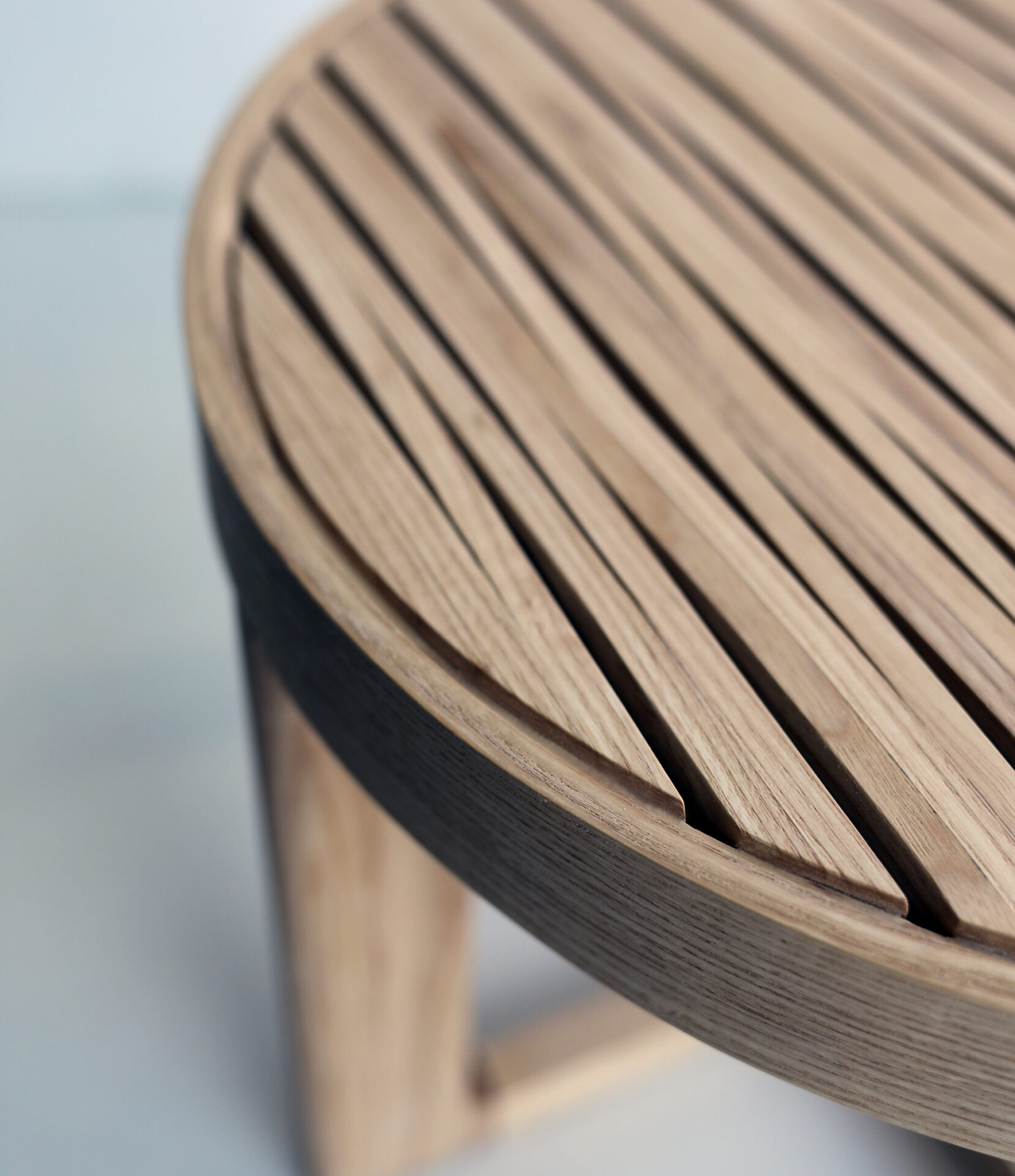 ‘excerpts from the little table project’ consists of several small tables made during the quiet times of the pandemic. These pieces further our interest in steam bending as a means of creating two dimensional surfaces using linear elements. Variability is introduced into the surface pattern despite the repetition of the same process over and over. The tables are built without design drawings and decisions are made at the moment of production as each wood element is steamed. As a result, they are similar to painting or drawing as one line is determined in relation to the last.