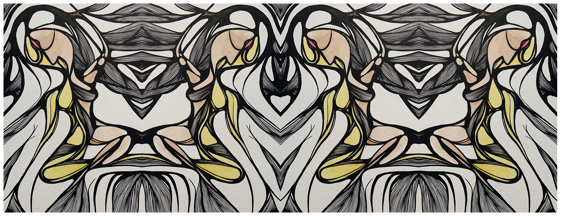 ‘Marked Figures’ explore the fluid definition and role of “the line” in regards to the identity of a South Asian female figure in space. It is an investigation on how one forms an identity in a changing existence, and how those markings deconstruct and construct the definition through their usage. These lines, like tree trunks, become a record of the effect of the passage of changing time on the forms or the space in which they exist. That like tattoos, the lines are an attempt at reproducing/ reconstructing individual identity. An interplay between the similarities and differences of individuals and others in similar spaces. A question of whether the lines are the ones that construct the figures or whether it is the figures which determine the lines and their significance in their occupied spaces.