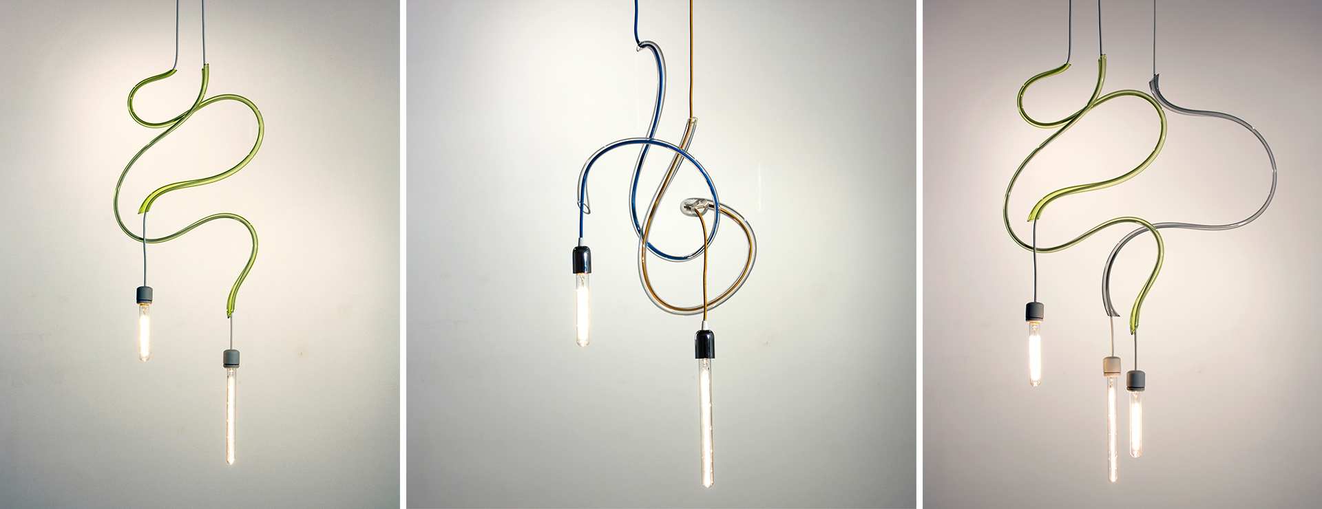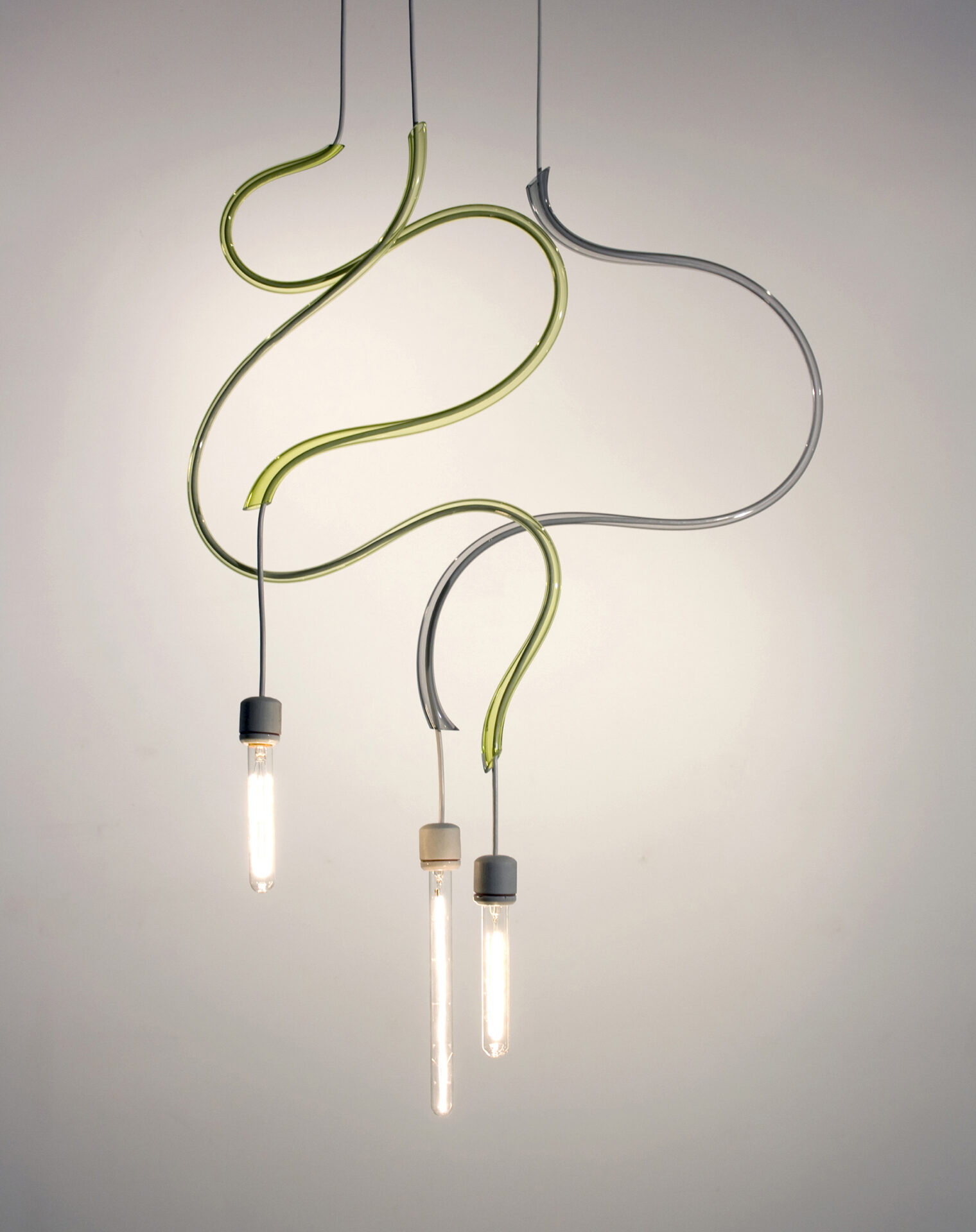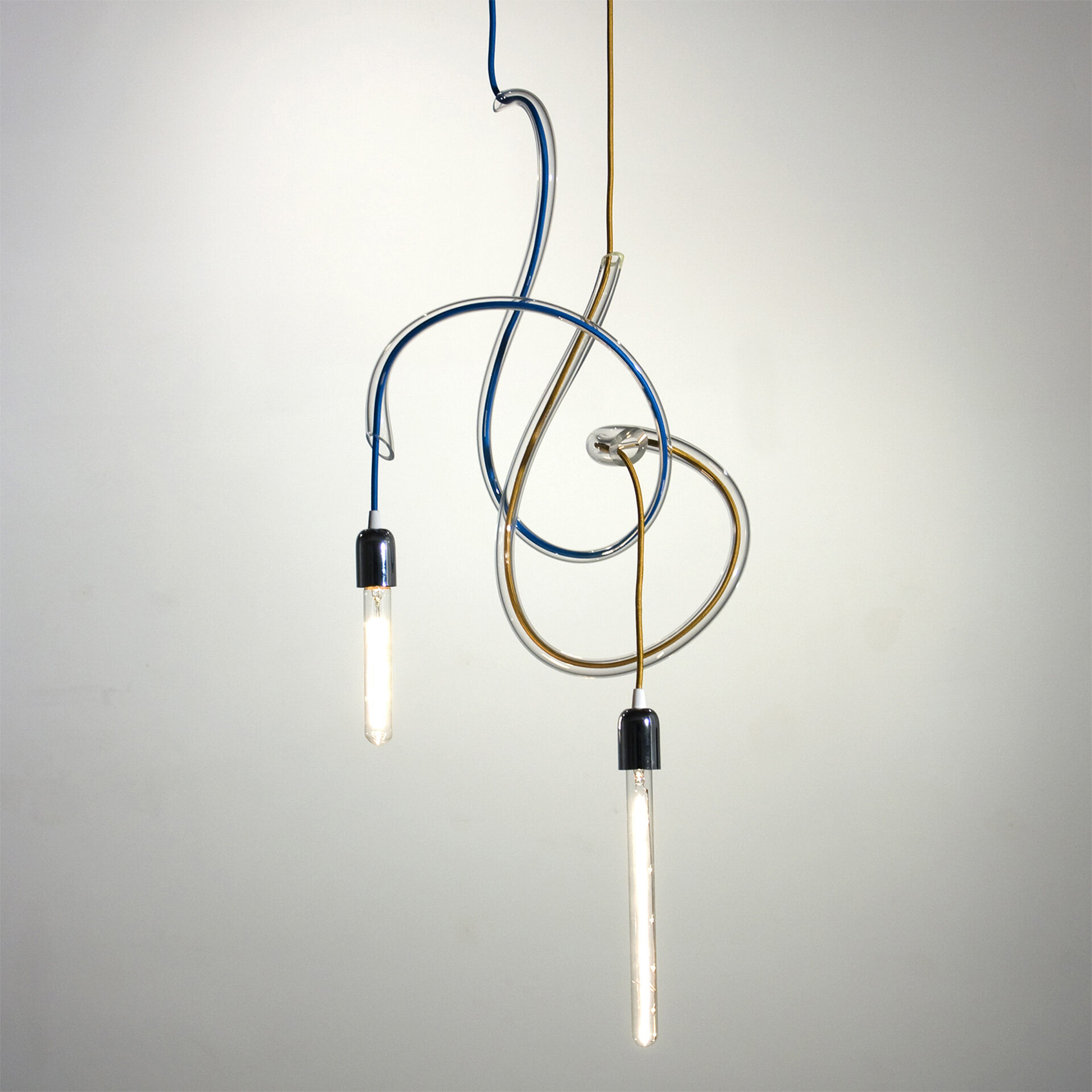 Turner adds, “The ‘Ribbon’ light is a beautiful nod to a technical process. When hot glass is blown, stretched, and quickly bent, you can achieve these simple shapes, which are an ode to the laborious process. It’s a balance between a lighting fixture and a glass installation, and the thin curvatures in bold colours change their appearance as you walk past them.”