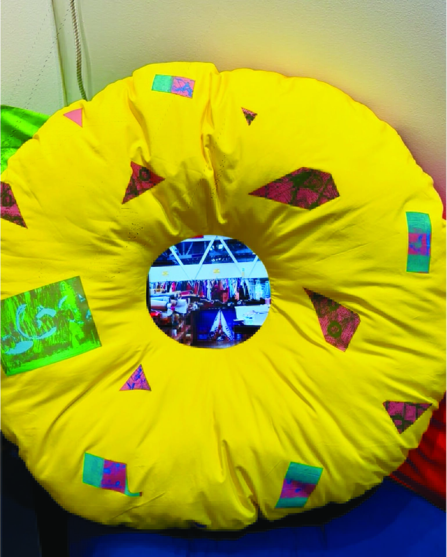 Composed from Flaneur’s dyed-to-order fabrics, preserved in its decade-long archive, and collectible vintage textiles gathered across the world, the mural merges quilting, collage, printmaking, soft sculpture, and resin-hardened cloth. Its traces spill beyond the staircase: visitors may encounter ceramic counterparts—vessels, tokens, and fragments—that seem to have wandered away from the banquet.