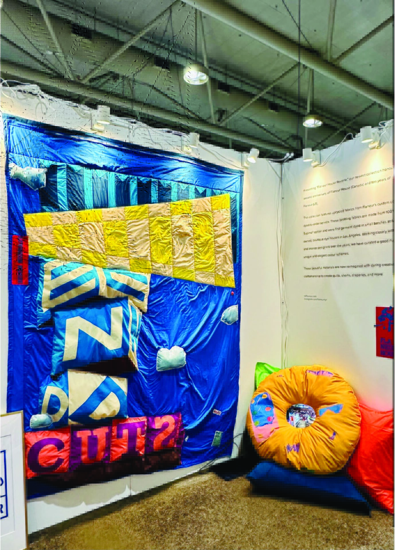 ‘Rumoured Feast’, a fabric wall mural, transforms the staircase of SMEG Toronto flagship into a vertical theatre of color and texture. Fabrics gather into collages and soft forms— architectural forms, vessels, sweets, and other offerings—rising, hovering, and folding like the memory of a celebration that refuses to fade, an eruption of pleasure, abundance, and tactile delight.